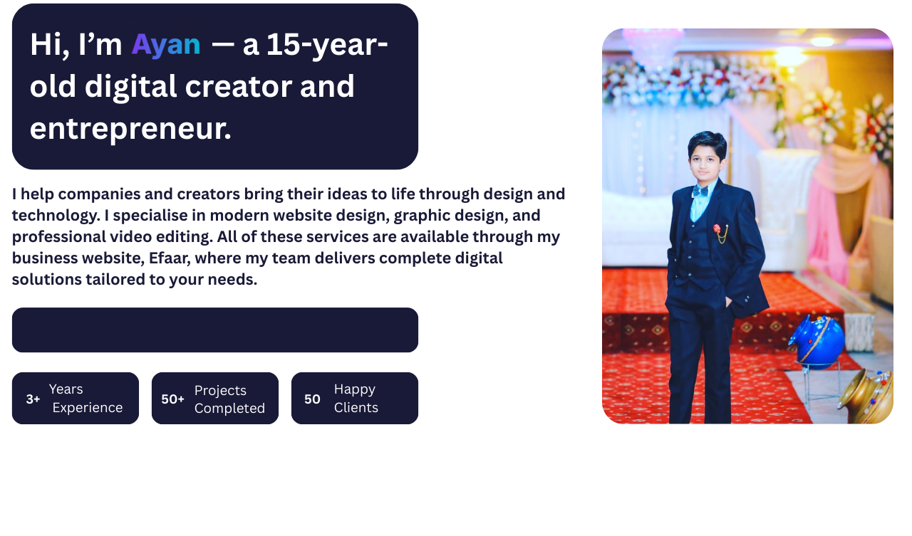 I’m Ayan, a Pakistani 15-year-old digital creator with a strong passion for design and technology. I enjoy creating modern websites, eye-catching graphics, and high-quality video edits. I’m constantly learning new skills, improving my creativity, and exploring better ways to turn ideas into visually appealing and effective digital content.